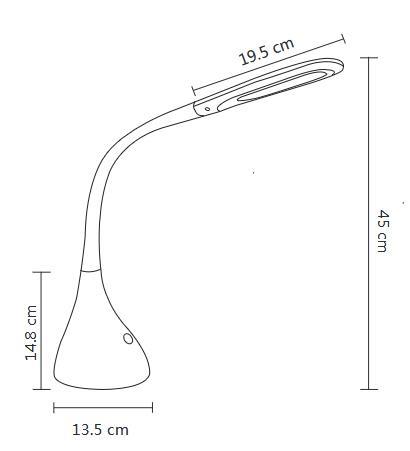- širina podstavka 13,5 cm, višina 45 cm, dolžina svetilnega dela 19,5 cm