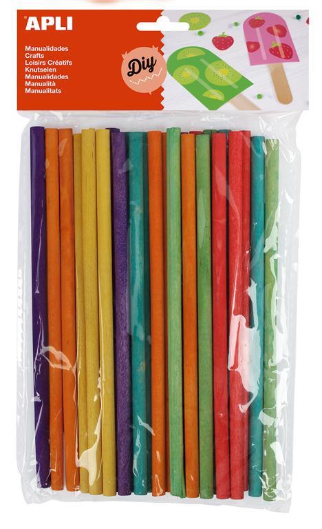 - okrogle lesene palčke velikosti 150 x 5 mm v različnih barvah: zeleni, modri, oranžni, vijolični, rdeči in rumeni