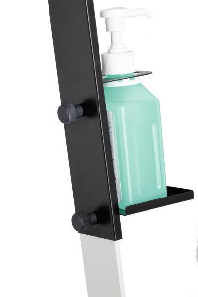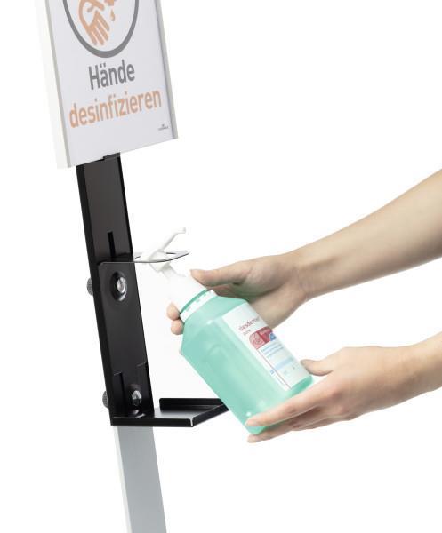 - trden, visokokakovosten dozirnik za dezinfekcijsko sredstvo kot premično samostoječe stojalo z aluminijasto informacijsko ploščo
