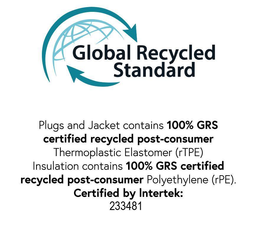 Vtiči in ovoj vsebujejo 100% Global Recycled Standard* certificiran post-consumer recikliran TPE, izolacija prevodnikov pa vsebuje 100% Global Recycled Standard* certificiran recikliran PE, certificirano s strani Control Union 1409828.