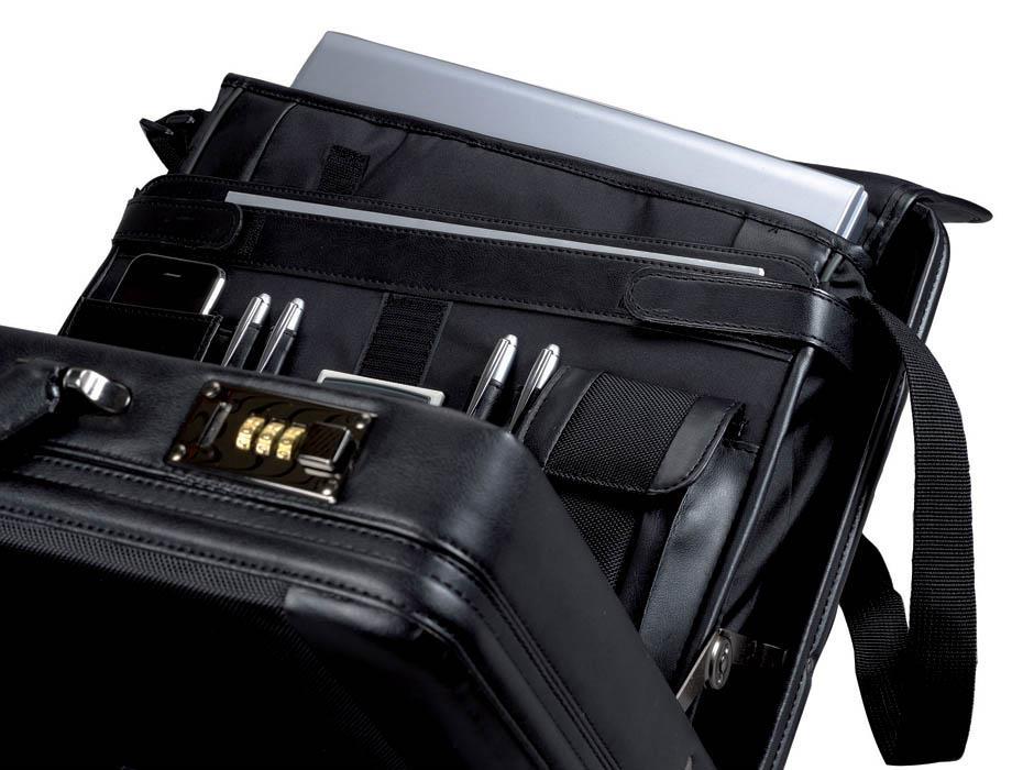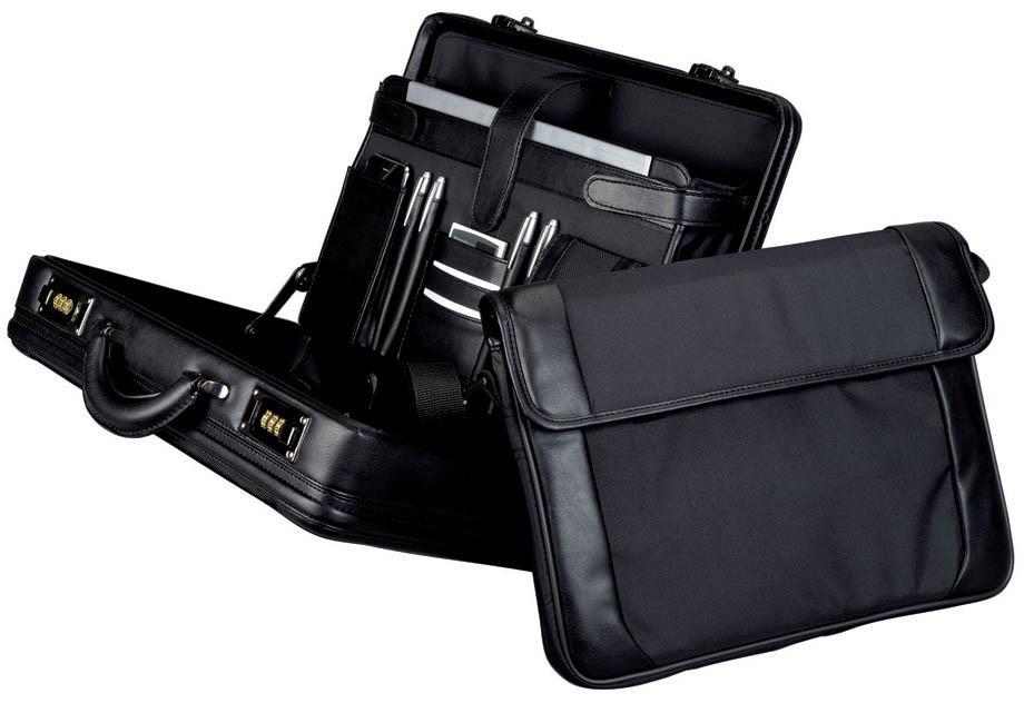 - v notranjosti ovitek za prenosni računalnik, ki ga lahko uporabljate tudi posebej, štiri zanke za pisala, dva predala za dokumente A4, dva žepa za manjše predmete, trije žepki za vizitke