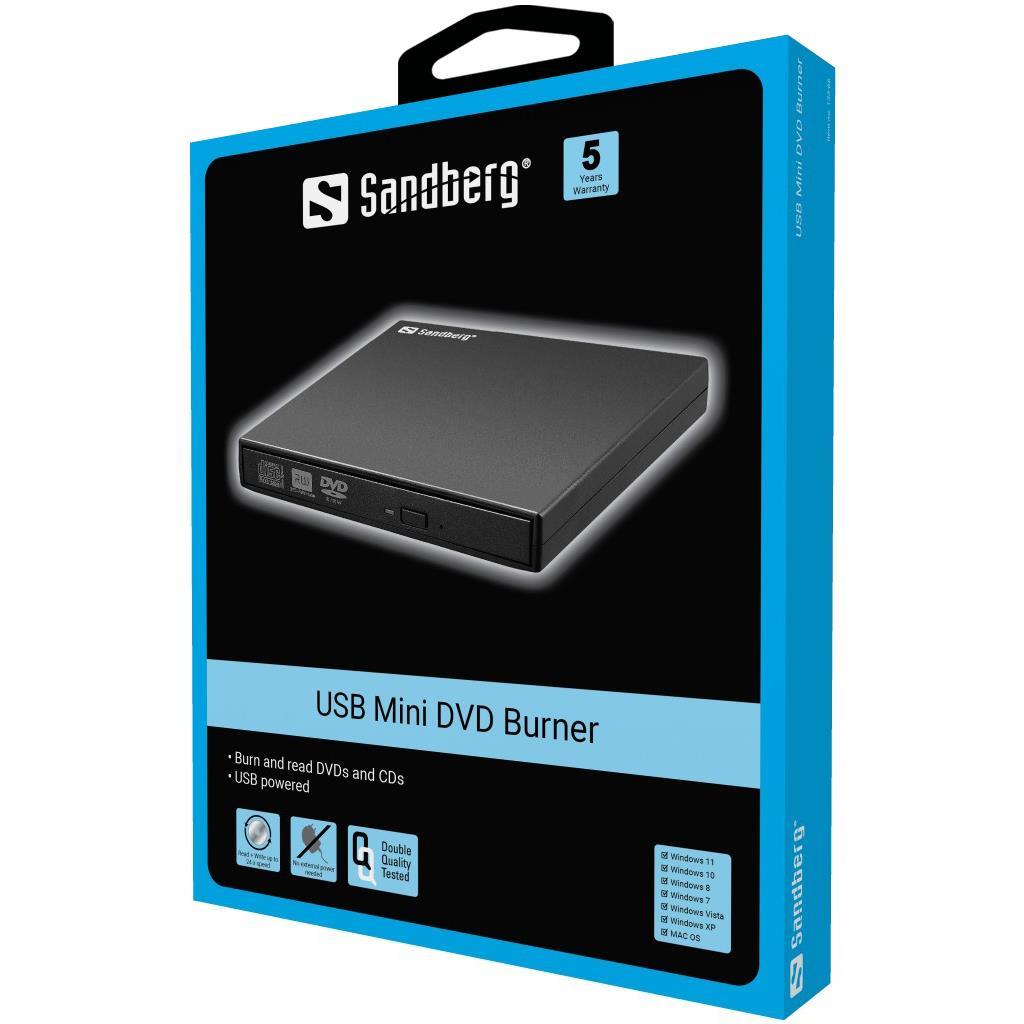 Zapisovalnik Sandberg USB Mini DVD Burner omogoča zapisovanje in branje CD in DVD medijev. Ta zapisovalnik je popolni dodatek za računalnik brez pogona za CD ali zapisovalnika za DVD medije. Zapisovalnik se napaja preko vhoda USB računalnika, zato ga lahko uporabljate tudi na poti, brez potrebe po iskanju vtičnice. Dobro pa se obnese tudi kot predvajalnik vaših DVD-jev na prenosniku. Uporabljate ga lahko takoj, saj ne potrebuje nobene posebne programske opreme.